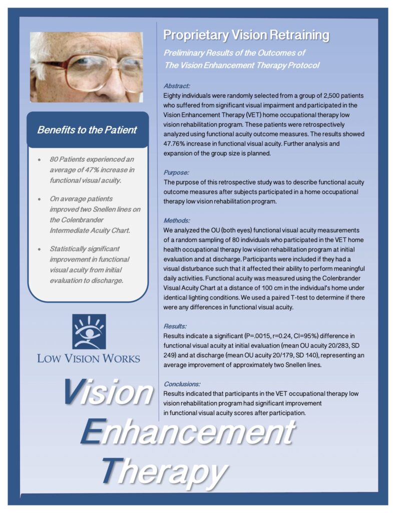 Results indicated that participants in the VP occupational therapy low vision rehabilitation program had significant improvement in functional visual acuity measures after participation.